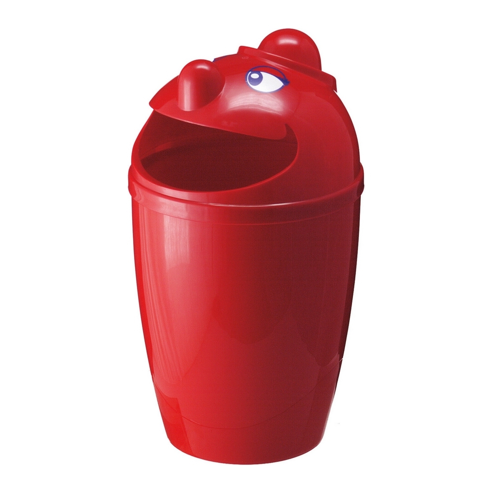 Afvalbak van slagvast polyester. Het losse deksel met ogen en neus heeft een inworpopening in de vorm van een mond.
