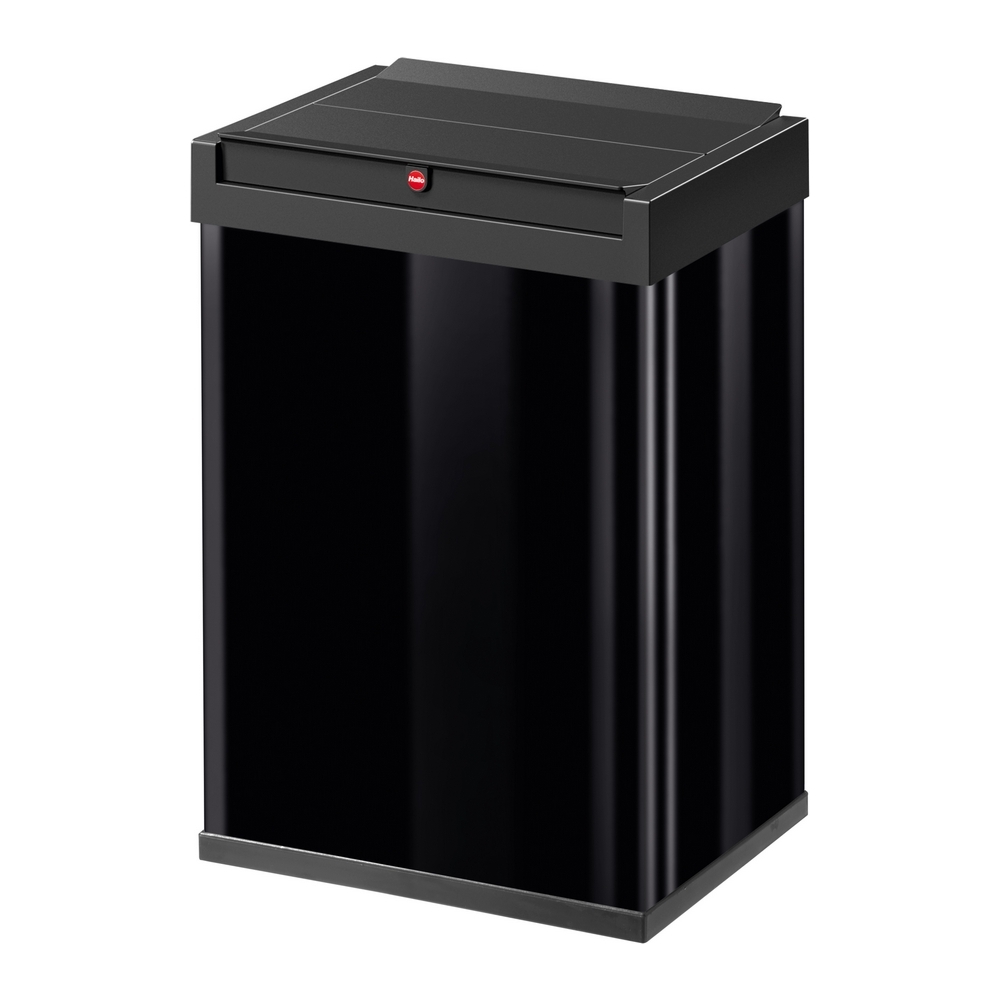 Rechthoekige afvalbak van staal met zelfsluitend, in tweeën gedeeld swingdeksel van kunststof. Met gepatenteerd afvalzak-klemframe. Vlak verpakt, maar snel in elkaar te zetten.