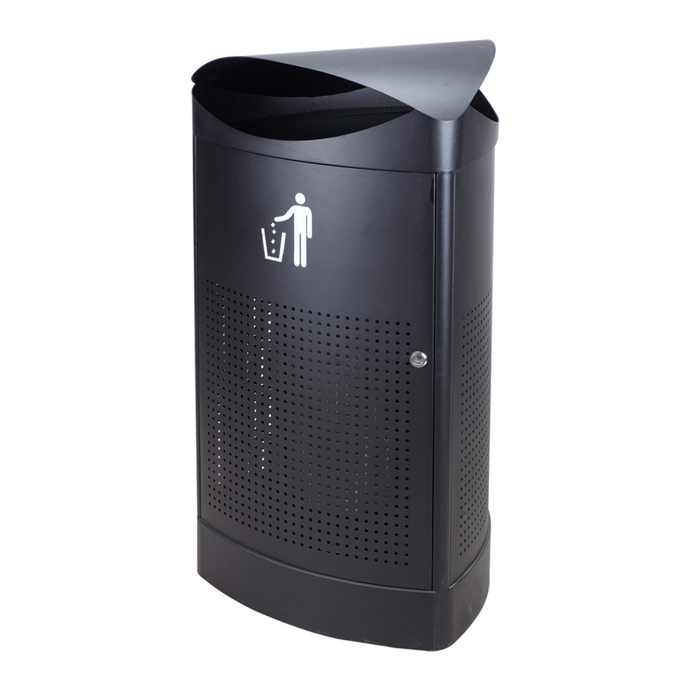 Eigentijds vormgegeven driehoekige buitenafvalbak van gepoedercoat staal. Voorzien van afdak en een metalen binnenbak, die via twee inworpopeningen te bereiken is.
