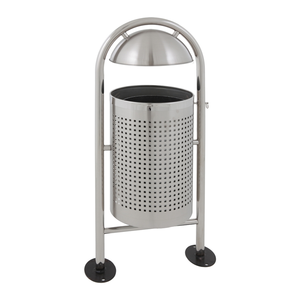 Gepoedercoat staal of mat RVS buitenafvalbak in beugel op poten met gegalvaniseerde binnenbak. Te bevestigen aan de grond.