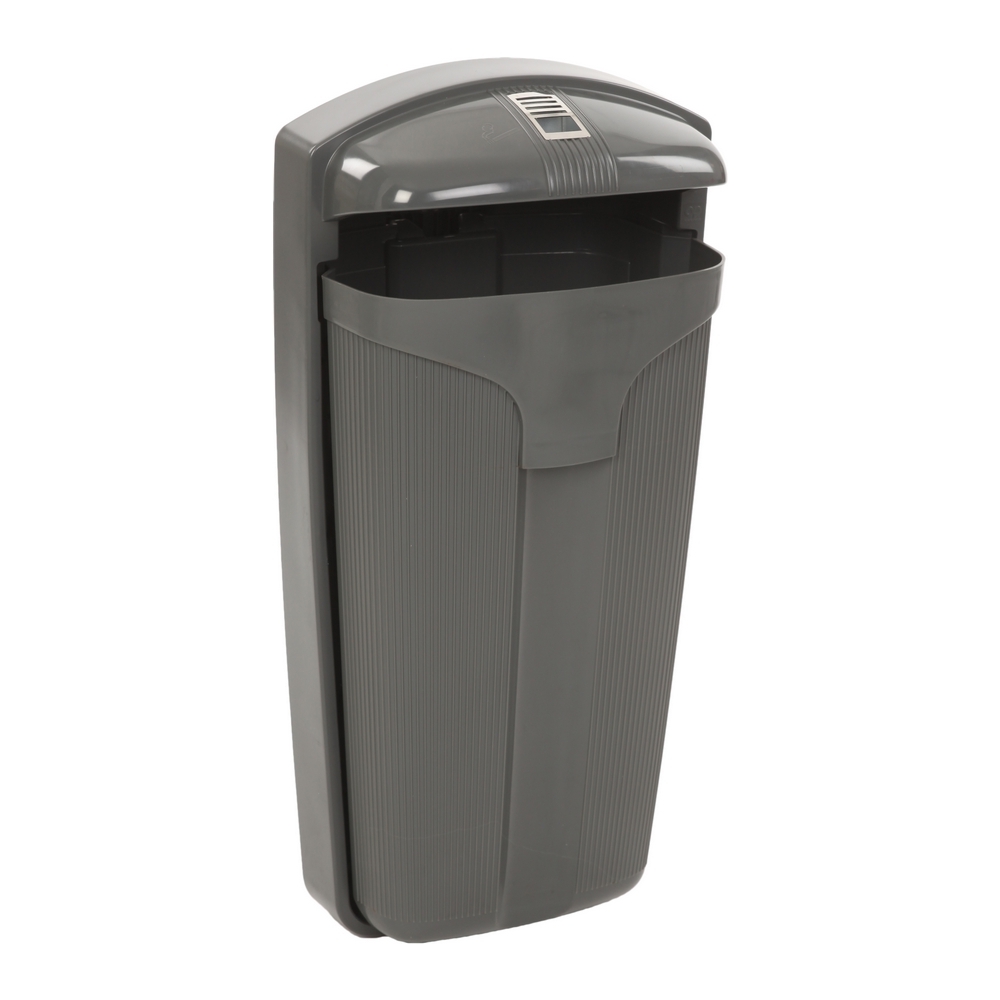Buitenafvalbak van UV-bestendig geïnjecteerd HDPE voor wand- of paalbevestiging. De kap beschermt tegen inregenen en voorkomt de inworp van volumineus afval. Voorzien van asbak op de top. Na het ontgrendelen via een driekantslot kan de afvalbak via de voorzijde volledig uitgenomen worden. De extra handgreep aan de voorzijde vergemakkelijkt het ledigen. De geribbelde stijllijnen maken het aanbrengen van graffiti moeilijk.