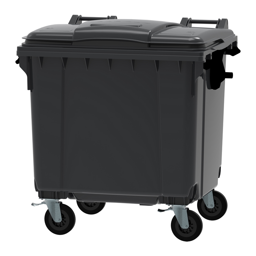 Grote capaciteit 4-wiel container van hoogwaardig kunststof (HDPE) met vlak deksel. Voorzien van vier ergonomische handgrepen aan de zijkant en vier rubberen wielen waarvan twee met rem. Inclusief opnametap om de container aan de belader te kunnen hangen voor het ledigen.