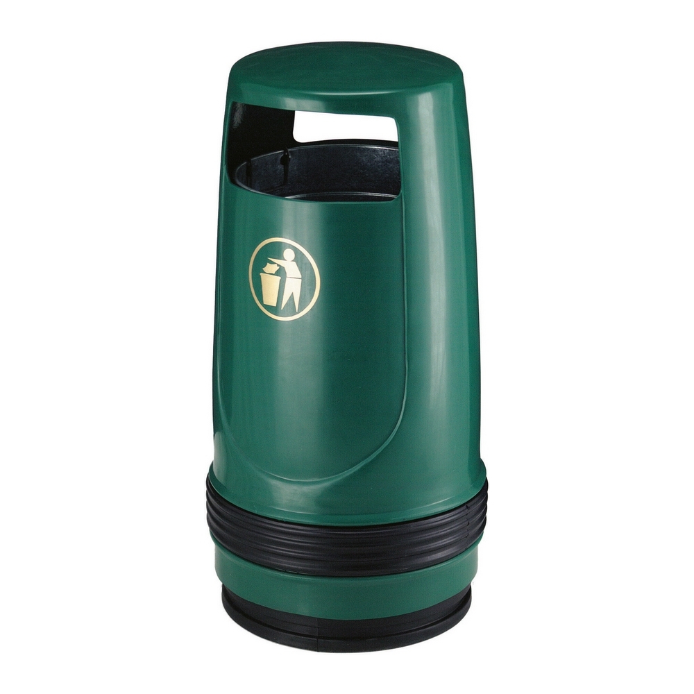 Kunststof, UV-bestendige afvalbak met metalen binnenemmer en 2 inworpopeningen. Voorzien van sluitmechanisme dat het gemak van het legen combineert met een maximale veiligheid. Inclusief bevestigingsmateriaal voor vloerbevestiging.