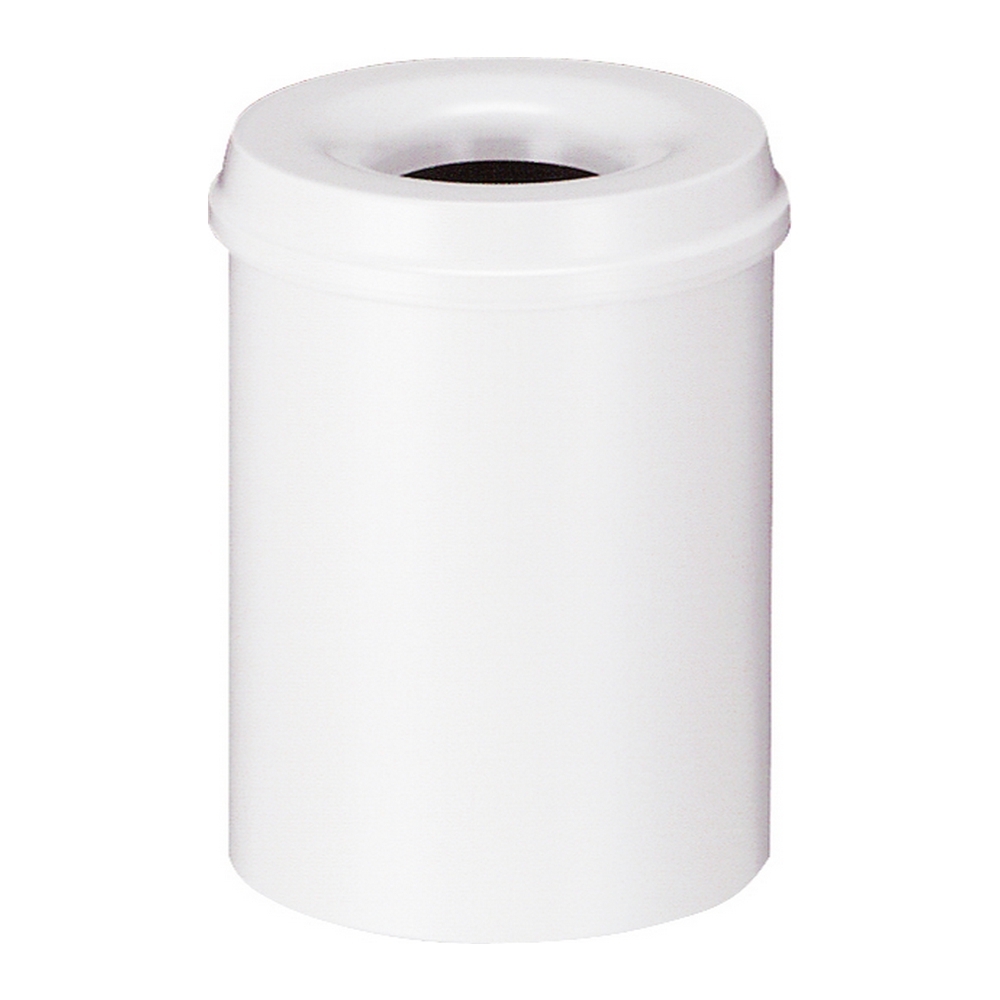 Ronde metalen papierbak uit één kleur of met zwart deksel. Inworpopening Ø 11 cm.