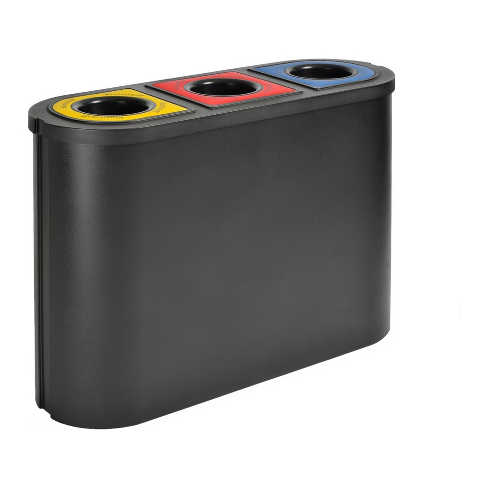 Afvalscheidingsunit voor 3 afvalstromen: Papier, Kunststof, Restafval (in 4 talen). Een duurzame oplossing vervaardigd uit tot 100% gerecycled kunststof (HDPE) van uitstekende kwaliteit garandeert een lange levensduur. Voorzien van 3 afzonderlijke vloeistofdichte kunststof inzetbakken (3x 45 liter) die gemakkelijk via de open te klappen deksel te legen zijn. Deksel blijft door het speciale scharnier geopend in iedere gewenste stand. Eenvoudig en hygiënisch te reinigen. Gemakkelijk te verplaatsen. Biedt met zijn slanke, plaatsbesparende design een prima oplossing in zowel kantoren en scholen als in openbare ruimten.